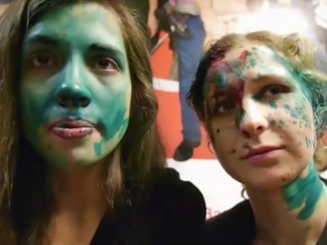 В пояснениях к видео говорится, что "организованная группа лиц ворвалась в Макдональдс напротив Московского вокзала и атаковала участниц Pussy Riot и правозащитников" в 7:20 утра "при помощи перцового газа, зеленки и шприцов со спиртом".