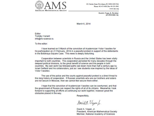 Письмо AMS в поддержку академика В. Васильева С сайта ams.org Со словами поддержки в адрес ведущего российского математика, академика РАН, главного научного сотрудника Математического института РАН Виктора Васильева обратились члены Европейского и Американского математических обществ. Их заявления были опубликованы на cайтах обществ: www.euro-math-soc.eu и www.ams.org.