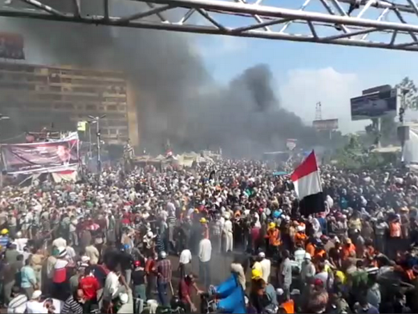 Площадь перед мечетью Рибиат ал-Адавиййа, 14 августа 2013 года, источник: Арабская Википедия C 14 по 15 января 2014 г. в Египте прошел референдум по новой конституции, выработанной Конституционной ассамблеей под председательством Амра Мусы. Большинство принявших участие в референдуме египтян (98,13 %) проголосовало в пользу принятия нового основного закона в то время, как лишь 1,87 % голосов было отдано против. Известно, что основным противником принятия новой конституции было запрещенное движение «Братья-мусульмане» (ал-Ихван ал-Муслимун), чей фактический лидер Мухаммед Мурси был отстранен от власти в ходе военного переворота 3 июля, а действие принятой в ходе его правления конституции в декабре 2012 г. было приостановлено. Ассоциация призывала своих сторонников бойкотировать референдум 2014 г.