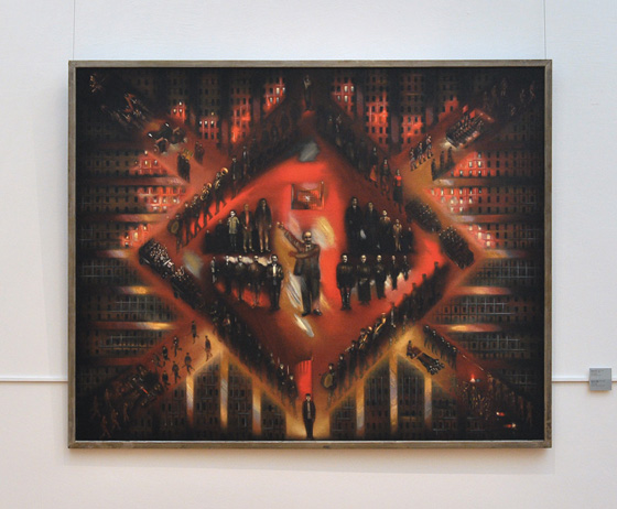 © Павел Отдельнов Климент Редько. Восстание. 1924-1925. Государственная Третьяковская галерея. Можно не видеть в «Восстании» церковной иконографии, пусть оно писалось не как икона, но все равно — как эмблема революции, построенная в ритме марша, на геометрии прямых углов и диагоналей, на динамичных лучах-векторах, прорезающих красно-черный город, дома которого, впрочем, похожи не только на конструктор, по инерции распространяющийся во все стороны, но и на тюрьмы. Редько интересовался вопросами энергии, света как ее воплощения, конструкцией как выражением формы, и, осознанно или нет, «Восстание» вышло противоречивым. Приветствуя революцию, оно проговаривается о ее темных сторонах. Мир тут — отлаженный механизм. Под пресс этого разросшегося механизма много лет спустя попадет и Редько, хотя исключение из Московского союза художников за западное влияние — конечно, не самое страшное, что могло случиться.