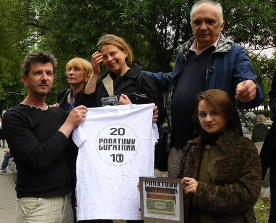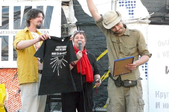 © предоставлено Антоном Литвиным Вручение премии лауреату сезона 2010-2011 Андрею Монастырскому на территории «ОккупайАбай», 2012 Литвин: Что-то сбили меня с пафосной речи. Когда мы придумывали логотип, получали свидетельство авторского права на название «Соратник», мы уже дальше действовали вместе, и, естественно, кроме моей первичной интенции как художника, что такая премия нужна, все остальное было сделано нами вместе, что, собственно, подтверждает свидетельство № 9669 от 16 февраля 2006 года. В 2006 году была присуждена первая премия. Мы долго с Олей обсуждали, как она должна выглядеть, какие у нее должны быть формат, периодичность и прочее, и в итоге после долгих споров сошлись на том, что это должен быть 101 художник. Я предлагал 100, но Оля, как человек с неожиданными решениями, предложила 101, на вопрос «Почему?» она отвечала, что так будет острее и заметнее. Цифра будет цеплять, и в этом, собственно, будет интрига. Мы сошлись на том, что мы с ней определяем 101 художника своим волевым решением и вкусовым чутьем, просим их назвать по три имени художников, на их взгляд, наиболее ярко представленных в прошедшем году, и, получив ответы, в идеале — 303 имени минус отказавшиеся, тупо суммируем результаты и получаем лауреатов, которых, понятно, всегда было несколько человек — три, четыре, пять, потому что у некоторых был одинаковый результат, но тем не менее мы ориентировались на верхнюю тройку. И один важный момент: у премии обязательно должен быть какой-то призовой фонд, безусловно, символический. А поскольку искусство в тот момент всегда продавалось не за рубли, а скорее за доллары, то появилась сумма, адекватная количеству заявленных участников, — 101 доллар. И вначале она выдавалась в банках с монетами по одному доллару, а потом стали выдавать их вклеенными в диплом.