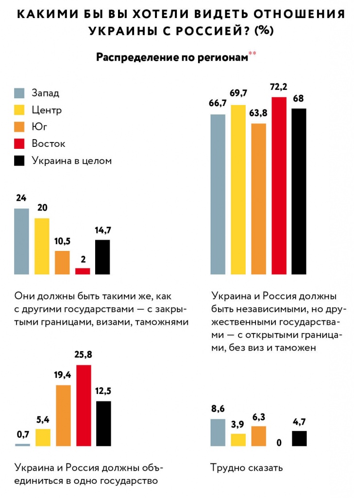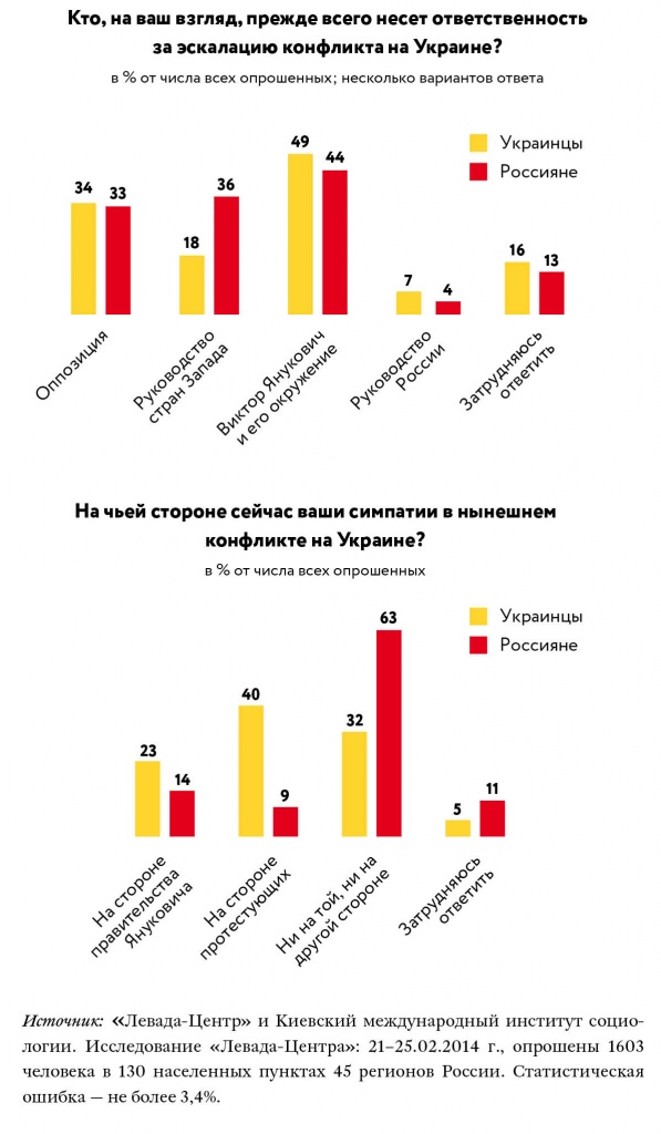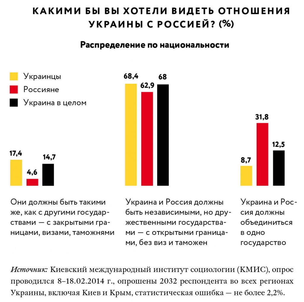 Известно, что крымско-татарское меньшинство резко возражает против вторжения России на их историческую родину. Но как обстоят дела с русским большинством в Крыму и в других восточных и южных областях Украины? Социологический опрос, проведенный в середине февраля 2014 года Киевским международным институтом социологии (КМИС) совместно с фондом «Демократические инициативы» Илько Кучерева, показал, что 41% жителей Крыма поддержали бы объединение России и Украины. Это чуть больше, чем результаты предыдущего опроса, проведенного в 2013 году: тогда за единое государство с Россией высказались 36%. Однако во всех других областях Юга и Востока страны цифры значительно ниже. В Донецке за объединение с Россией выступают 30–33% опрошенных, в Луганске — 24–29%, в Одессе — 23–24%, в Запорожье и Харькове — 9–17%.