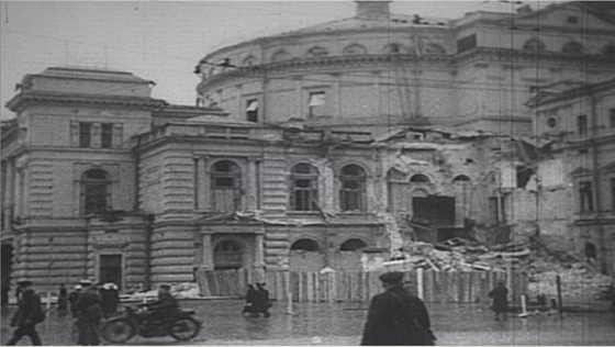 Кадр из фильма «Ленинград». Разбомбленный Мариинский театр. Осень 1941 г. — Значит, ты с самого начала планировал значительный массив хроникальных материалов, организованных определенным образом, через монтаж, в соответствии с музыкальной темой, — и небольшие вкрапления игровых, постановочных сцен.