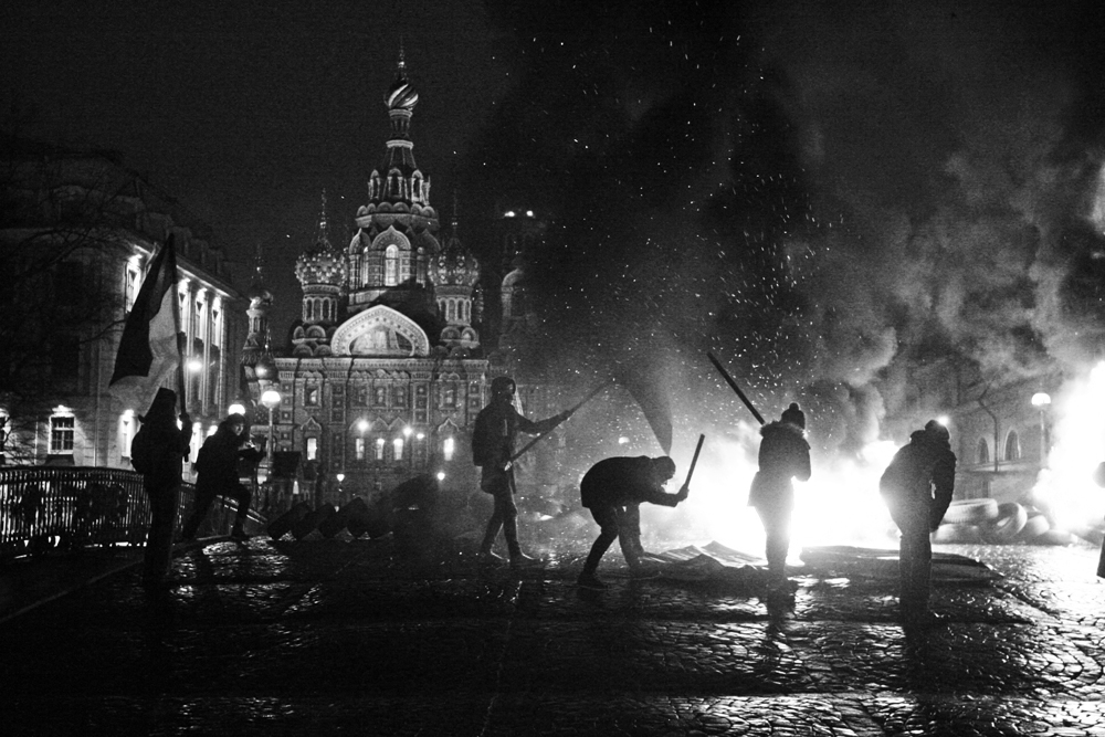 Пять человек развернули два флага — черный и флаг Украины и подожгли автопокрышки. Санкт-Петербург, 23 февраля 2014 г.