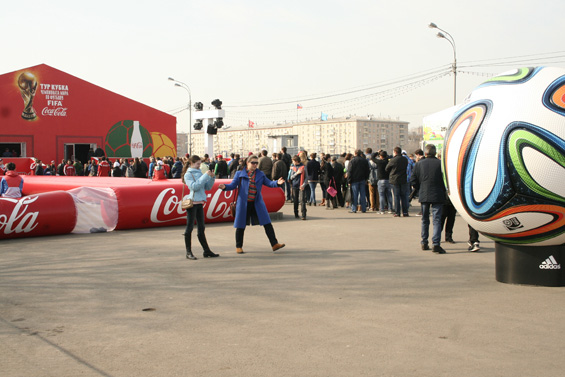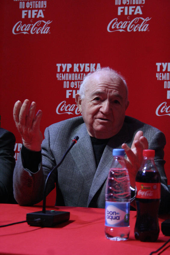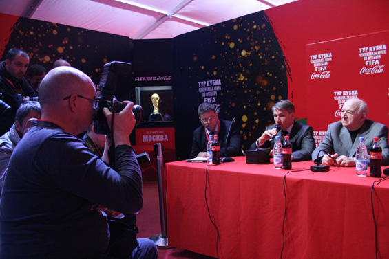 В рамках мирового турне Кубок Чемпионата мира по футболу добрался до Москвы. Событие весьма неординарное, даже для избалованной разнообразными турнирами столицы. В связи с этим, в построенном специально для Кубка компанией Кока-Кола павильоне, прошла пресс-конференция. А заодно и открыли свободный доступ к тушке трофея, - для всех желающих с ним сфотографироваться. На пресс-конференции в первую очередь попросили прояснить позицию по футбольному Крыму: