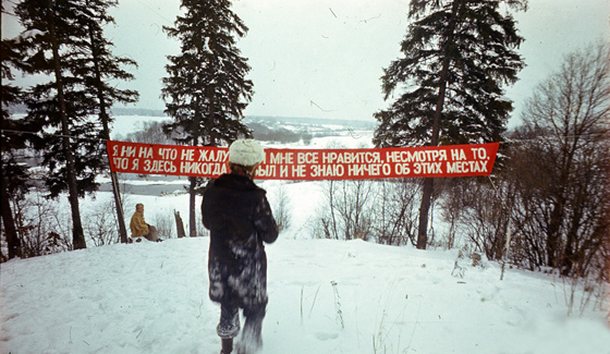 Группа «Коллективные действия». «Лозунг». 1977 Сложным политическим высказыванием о переплетении следов советского с настоящим, ставящим вопрос не только о продолжении, но и об утрате советского, стала выставка «Кино к романтику» Дины Караман, недавно прошедшая в Манеже и сопровождавшаяся цензурным скандалом — но в связи не с выставкой, а с текстом Романа Минаева к ней. В каждой из трех частей выставки (формат, заданный Манежем) романтизм выступает в двух неразделимых ипостасях: как живой порыв к иному, к истине — и как репрессивный механизм трактовки и казенной унификации этой истины. Например, на фоне старого слайда — модернистская библиотека в Ульяновске, шагающие перед ней пионеры и заволжские дали позади — восторженный голос современного экскурсовода рассказывает детям о важности семейных ценностей. Переплетение романтизма как порыва и романтизма как обязаловки отсылает к советской культурной парадигме, в которой пафос говорения от имени народа, говорения снизу окаменевал в бюрократии и госаппарате. Однако при всей противоречивости «романтического» на выставке в нем обнаруживается ядро подлинной лиричности, но ядро, существующее лишь будучи поставленным под сомнение, опровергнутым в себе самом. Выставка, как рассказывала Дина, началась с видео, снятого ей в горах: луна, освещенные тусклым светом ветви, облака курятся над хребтом. Это видео Дина снимала сугубо для себя и думала, что никогда не сможет показать его публично, так как иначе оно превратится в бесстыдную пошлость и утратит свой смысл. Но выставка стала индульгенцией романтическому порыву, включила его в систему сомнений и иронии, благодаря которым стало возможным этот порыв передать. И эта диалектичность романтического становится вызовом плоской идеологии современного российского государства, пытающейся включить в себя общественные порывы и устремления, воспроизведя таким образом советскую схему. Работа Дины указывает, что всеобщая истина и истина сугубо личная, истина, таящаяся от прямой репрезентации, взаимно необходимы, но их встреча, встреча универсального и интимного, влечет неразрешимый конфликт как знак присутствия истины.