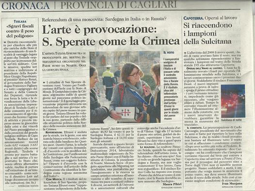 Итальянская газета со статьей, посвященной референдуму по присоединению Сардинии к России. Работа Татьяны Эфрусси. 2014 В соц-арте символы советской идеологии присваивались художником так, что в них обнаруживалась парадоксальная значительность пустоты — значительность, являющаяся не только эффектом присвоения репрессивных символов власти, но и ощущением утраченного смысла — смысла, например, марксистских высказываний. Призрак этого потерянного всеобщего смысла особенно ощутим на фоне абсурдной «приватизации» его оболочки, как в «Лозунгах» Комара и Меламида, где художники подписывают своими фамилиями речовки «Слава труду» или «Наша цель — коммунизм» и так актуализируют проблематику универсального/частного. Знаменитый транспарант группы «Коллективные действия» «Я ни на что не жалуюсь, и мне все нравится, несмотря на то что я здесь никогда не был и ничего не знаю об этих местах» также переключает регистр высказывания из адресованного всем лозунга в сугубо личное признание, а топосом, которому этот лозунг-признание адресован, становится некое не-место, описанное парадоксальным, внутренне противоречивым текстом. Эта внутренняя противоречивость, характеризующая пустоту, также указывает на утрату смысла в адресации ко всем, к универсальному человеку, лежавшей в основе советского проекта. Но художники заворожены этой пустотой, она служит для них ресурсом эстетического, а опустевшие оболочки утопии сохраняют способность указывать в какое-то иное, трансцендентное измерение.
