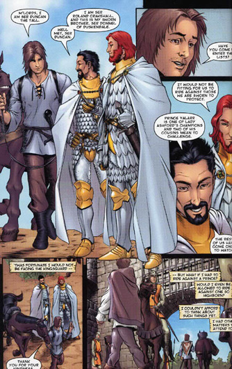 «Присяжный рыцарь» Комикс «Межевой рыцарь» — «Айвенго» Вальтера Скотта, рассказанный языком «Хранителей» Алана Мура. Вчерашний оруженосец Дунк Высокий приезжает на большой турнир, меняет все сбережения и лошадь на доспехи, которые ему не впору, и, ночуя в лесу, мечтательно наблюдает за далеким рыцарским пиром. Как только этот мир начинает его принимать, Дунк становится свидетелем несправедливости — принц Таргариен унижает девушку-простолюдинку — и решает вступиться. Опозоренный принц требует казни рыцаря, но герой пользуется правом на суд поединком. В Вестеросе поклоняются семи богам, так что за считанные часы Дунку и Эггу надо найти шестерых честных рыцарей, которые не побоятся сразиться за правду с порочным принцем и его черной свитой.
