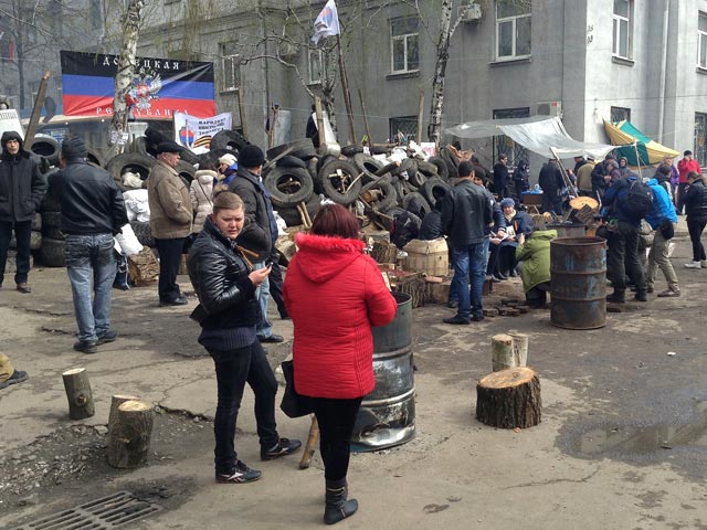 В городе Славянск Донецкой области, где накануне в стычках погибло несколько человек как со стороны протестующих, так и среди силовиков, ночь перед истечением срока ультиматума прошла спокойно. Баррикады на площади Октябрьской революции выросли выше человеческого роста.
