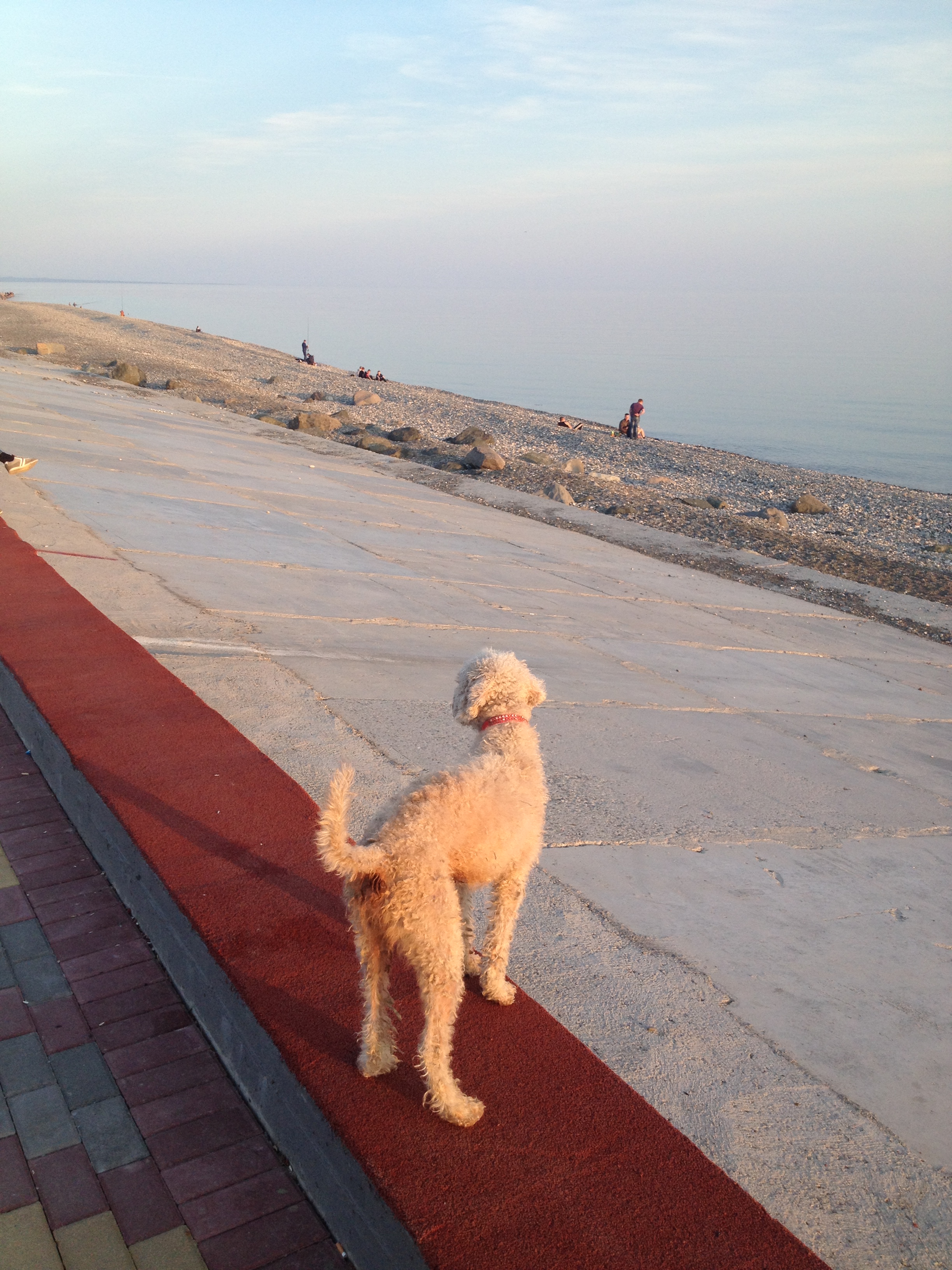 Узкая полоска – метров в пять шириной – гальки и камней отделяет море от пологого бетонного откоса. Поверху идет пешеходная дорога со скамеечками и фонарями, вдоль нее размечена красная велодорожка. На всей этой жаркой даже в апрельские 22 градуса каменной конструкции нет ни одного дерева.