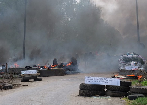 Горящие шины на блокпосту в Славянске. Фото Петра Андрусечко