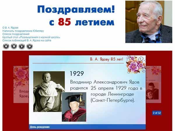 Поздравление на сайте ИС РАН На конгрессе «Украина и Россия: диалог», проходящем 24 и 25 апреля 2014 года в Киеве, мы попросили российских и украинских социологов высказать свое отношение к Владимиру Александровичу Ядову. 25 апреля классику российской социологии исполняется 85 лет. Публикуем несколько откликов на его юбилей.