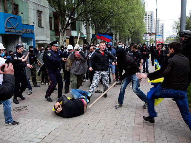 В Донецке, где вооруженные люди захватили телевышку, митинг за единство Украины закончился побоищем. Есть заложники