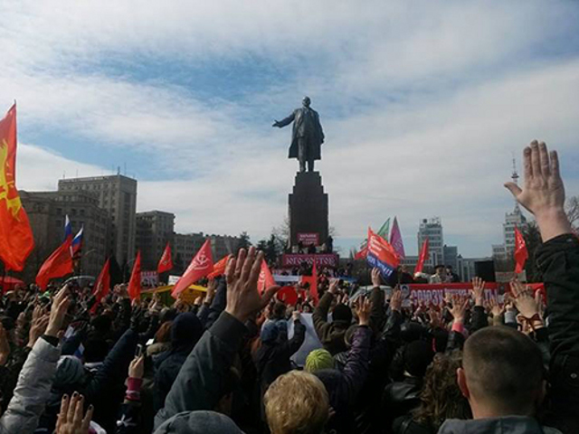 В то же время к памятнику Ленина на площади Свободы вышли на митинг около 400 сторонников федерализации Украины. Участники митинга требовали проведения местного референдума по вопросу федерализации, предоставления русскому языку статуса второго государственного, а также внеблокового статуса Украины.