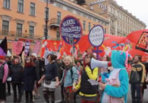 И, наконец, замыкает шествие колонна Антивоенного демократического марша. Здесь тоже активисты либеральных организаций и яблочники, а следом за ними пестрые группы ингерманландцев и ЛГБТ-активистов.