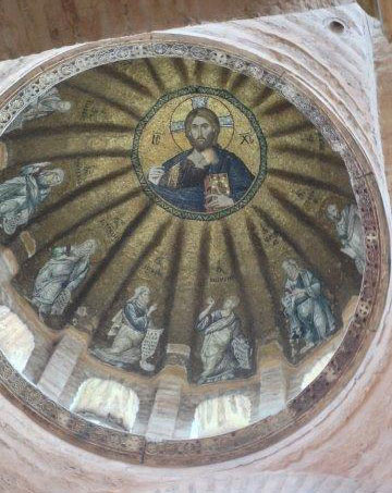 Мозаика Христос и пророки в куполе Паммакаристос (Фетхие джами) - А ничего тут удивительного нет, - говорит Д. Афиногенов. - Это называется «синдром Возрождения». И он характерен не только и не только для Турции, но и для Европы. Античность для Турции – это прошлое, в которое надо вернуться. И поэтому в музеях, путеводителях, книгах и газетах есть Древняя Греция. Есть и Древний Рим. Но не Византия, которую турецкое сознание видит замшелой, средневековой и дикой. Это такая идеологема – раз, и выключили плохое прошлое! В этой идеологеме нет места культурному преемству, явным и скрытым историческим связям. Она просто избавляется от историзма через апелляцию напрямую к «прекрасному прошлому».