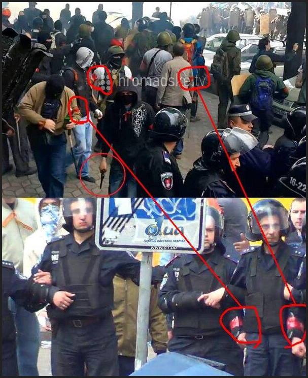 Сергей Дибров, одесский общественный деятель: "По ссылке (начиная с отметки 5:00) можно увидеть, что у некоторых милиционеров на руке примотана полоска скотча красного цвета. Я обратил на это внимание, но не придал особого значения. Позже мне сообщили, что такой же скотч был на руке у людей в одежде защитного цвета, которые стреляли в людей из нарезного оружия. Сможет ли руководство одесской милиции это объяснить?"