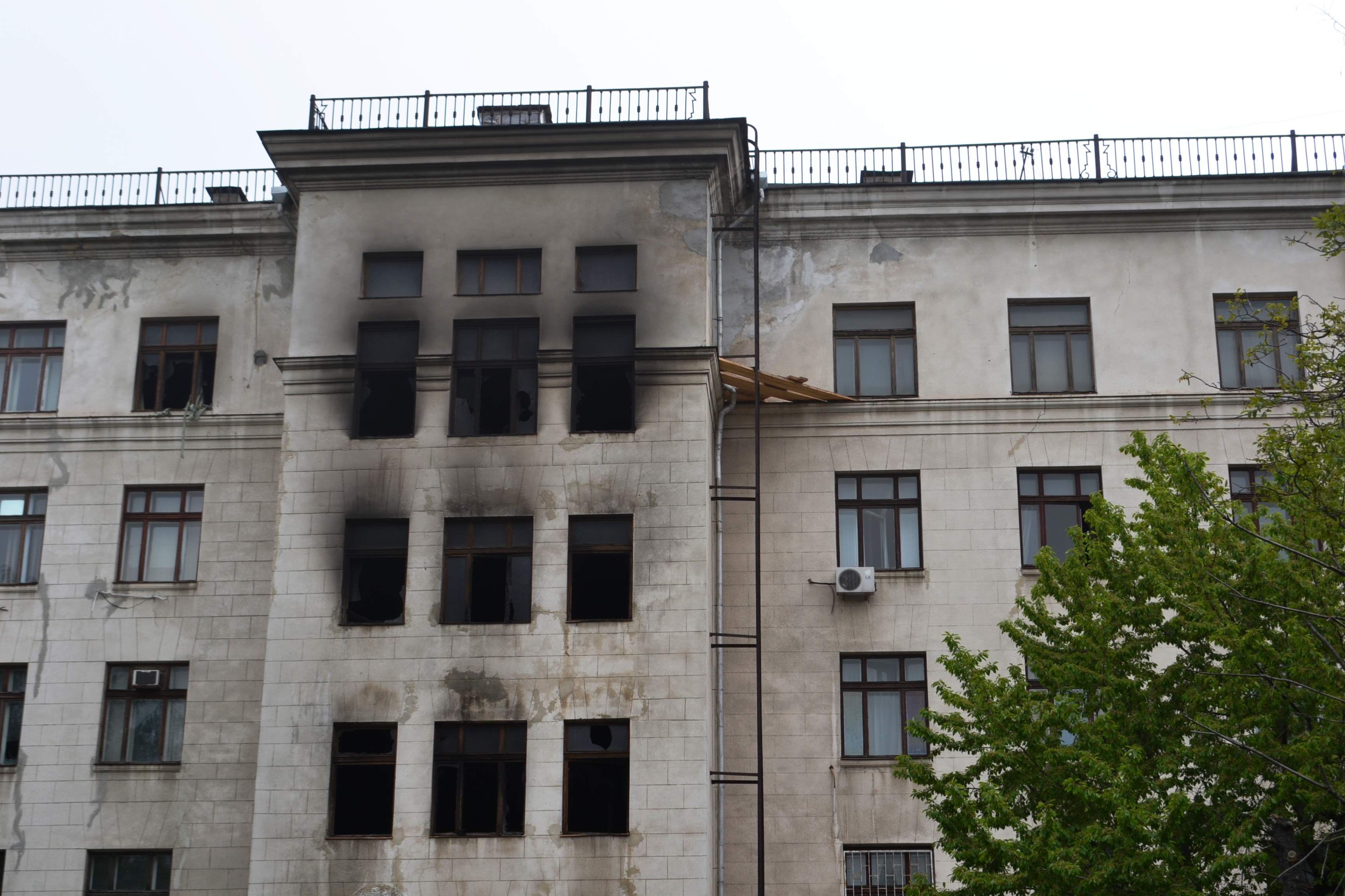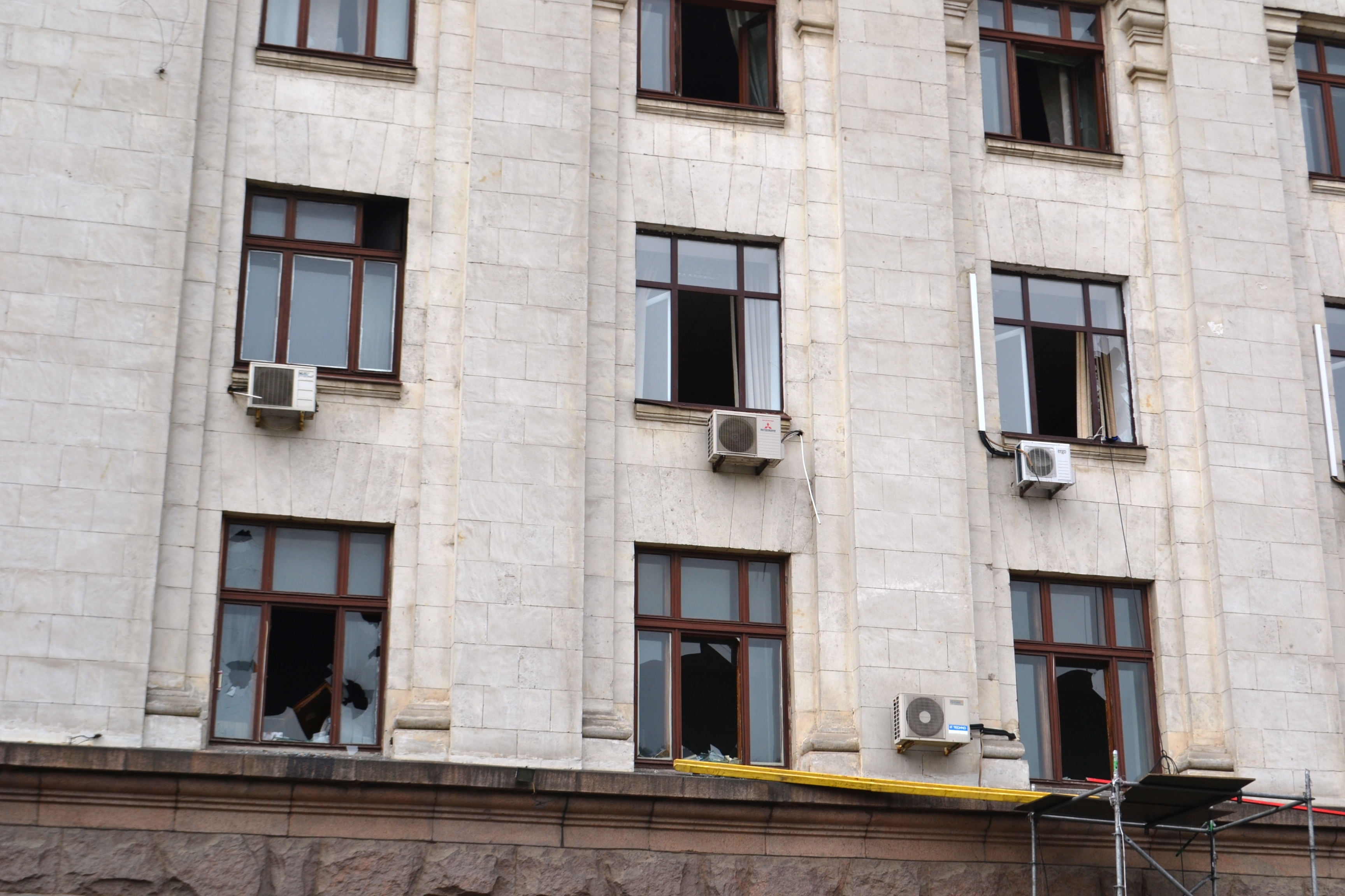 Разбитые стекла фасадных окон, конечно, еще не вставлены
