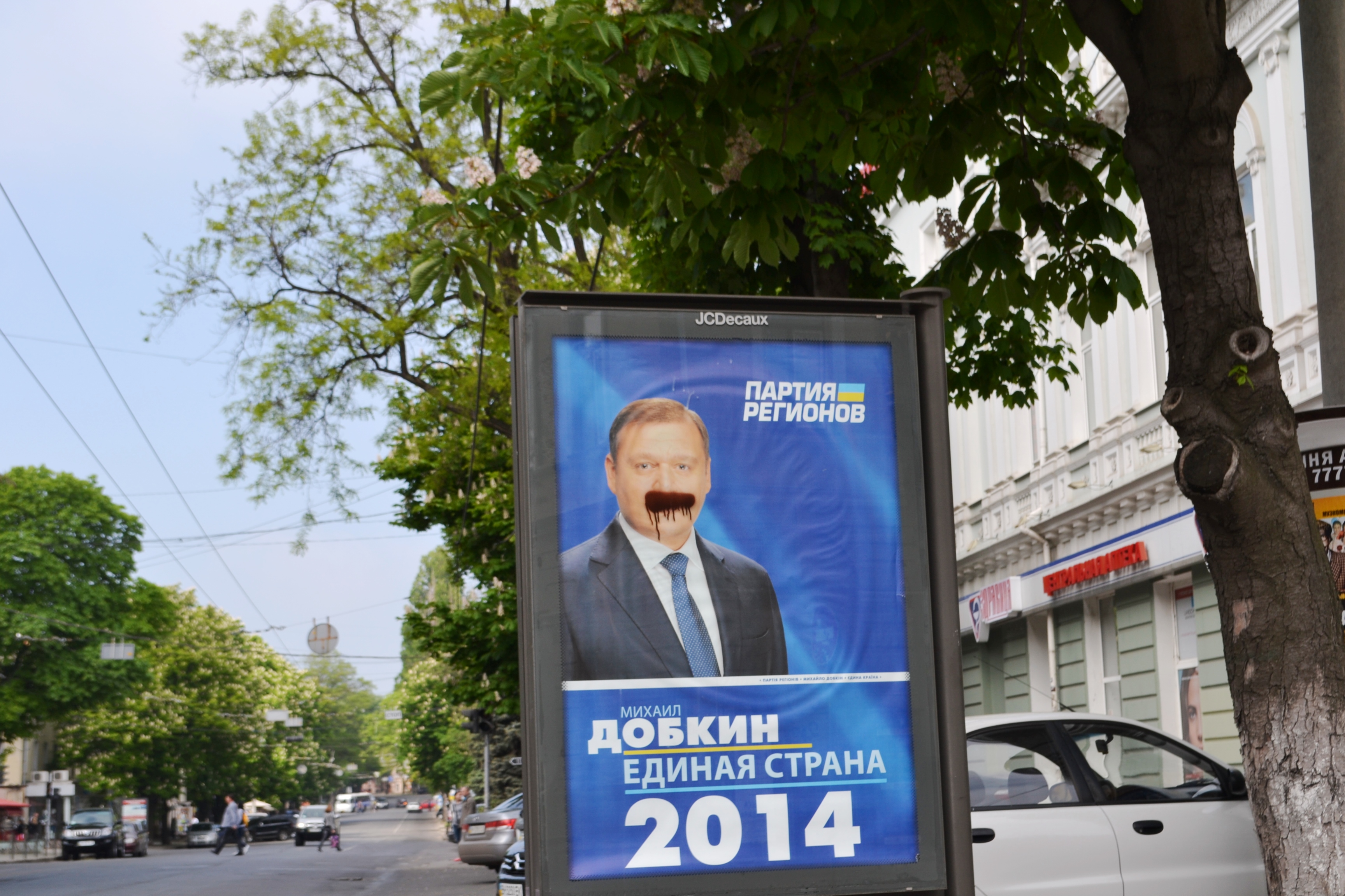 А еще один кандидат в президенты присутствует в Одессе в виде плакатов. И хотя плакат разрисован не слишком уважительно, президентскую кампанию в этом городе, похоже, сорвать не удастся.