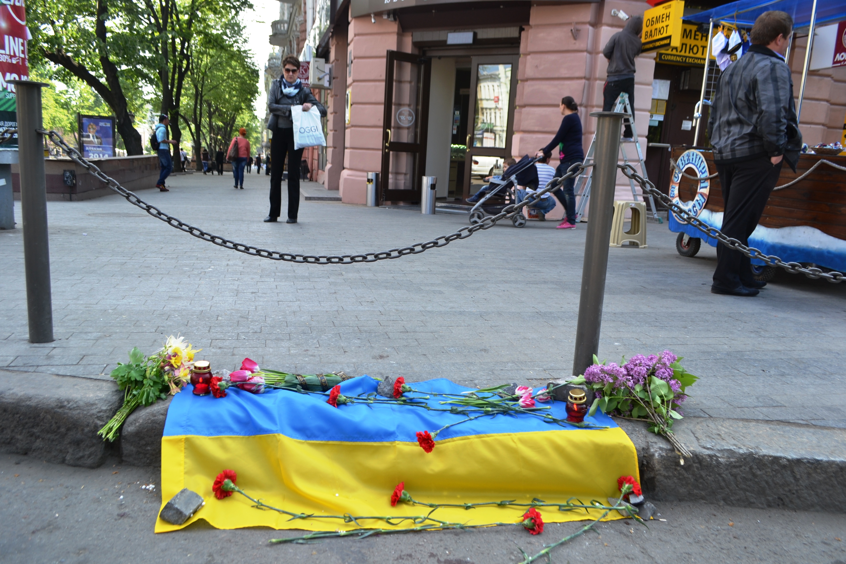 С Куликова поля я еду на Дерибасовскую. Там уже совсем ничего не напоминает о событиях вчерашнего дня. Люди, которые работают в ресторанчиках вдоль улицы, говорят, что уборка шла всю ночь. И только в одном месте я обнаружила памятные цветы.