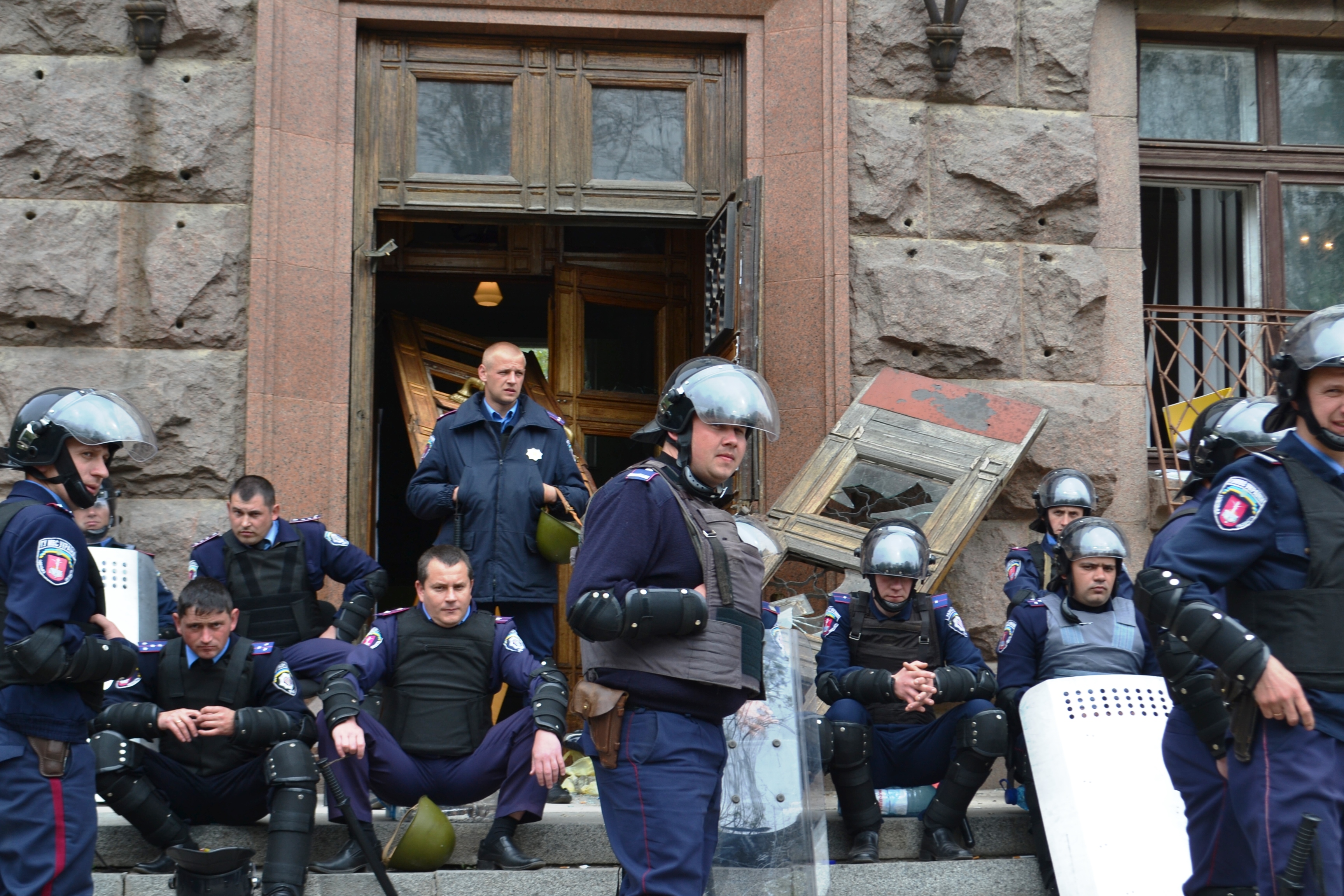 И посмотрите, как досталось этим дверям в торце здания. Ночью я видела здесь стычку между "антимайдановцами", которые выходили из здания, и активистами самообороны Одессы.
