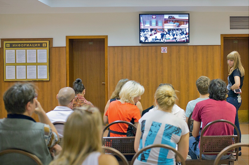 Журналисты, которым не хватило места в зале, следят за процессом по телетрансляции в коридоре суда