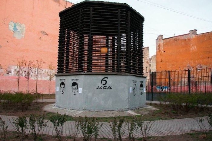 Сегодня около пяти утра анонимные активисты нанесли изображения в поддержку «узников 6 мая» на вентиляционный киоск метро на пересечении Коломенской улицы и Свечного переулка. На сторонах киоска появились портреты заключенных с именами и фамилиями, а также статусом, который сейчас имеет их дело.