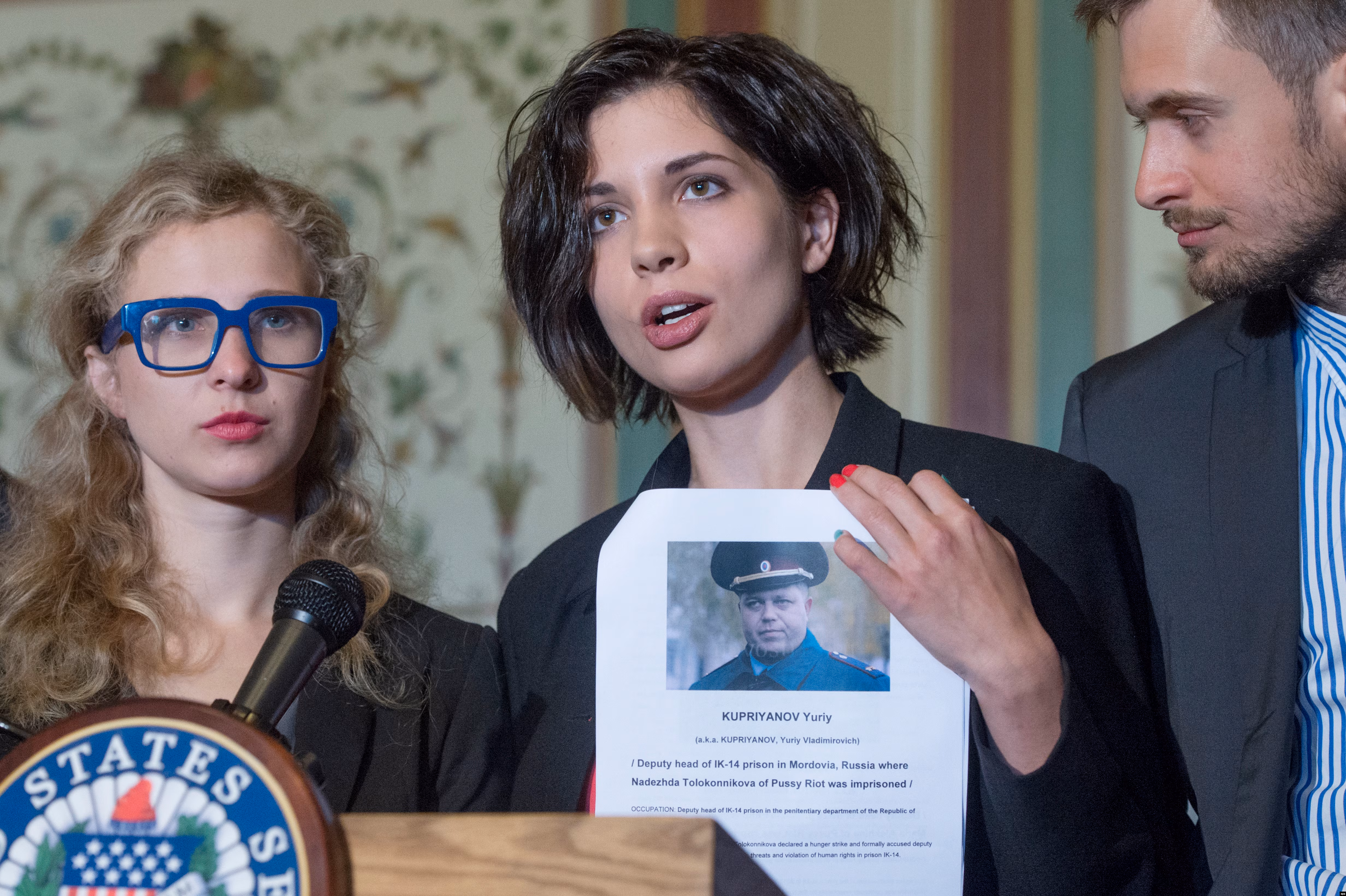 Во вторник члены панк-группы "Пусси Райот" Надежда Толоконникова и Мария Алехина встретились с американскими законодателями и передали им список из шестнадцати имен российских официальных лиц, которых они предлагают подвергнуть санкциям за нарушение прав участников протестов на Болотной площади.На Капитолийском холме двух девушек из "Пусси Райот" встретили как больших знаменитостей. В сопровождении членов Хельсинкского комитета во главе с сенатором-демократом Беном Кардиным они вышли к репортерам, и Надежда Толоконникова так описала цель появления "Пусси Райот" в Конгрессе США: