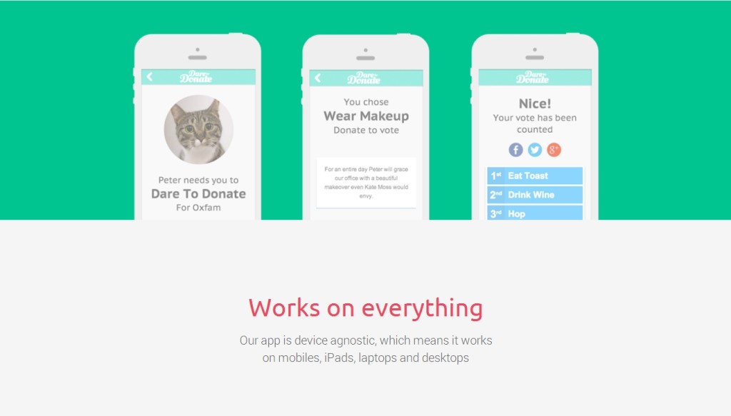 C помощью «Dare to Donate» любой человек или организация смогут предложить список небольших заданий, которые они готовы выполнить, чтобы собрать средства для своего проекта. Все эти задания выставляются на голосование, чтобы выбрать, какое из них выполнит фандрайзер. В голосовании может принять участие каждый и для этого нужно пожертвовать указанную сумму.