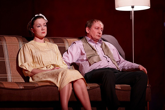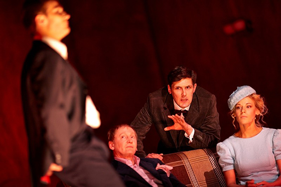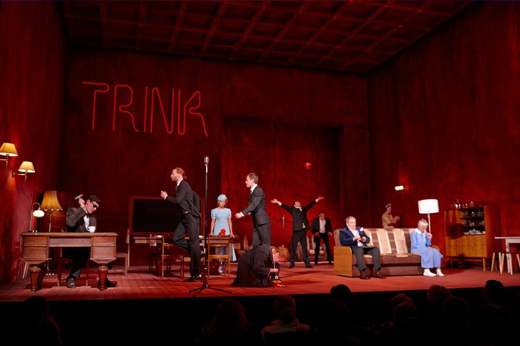 Графиня (сценографиня) Лариса Ломакина на сей раз поместила актеров в линчевскую красную комнату — где еще, скажите на милость, мы обычно встречаем карликов и великанов? От Возрождения — рельеф потолка, от культурных толщ — размытые контуры гравюр Доре по стенам. Еще нехитрая меблировка и пара винтажных радиомикрофонов. Микрофоны напоминают о ежегодных Луперкалиях, празднике, иначе именуемом «Гвоздем сезона»: на нем отважные кавалеры Епишев и Богомолов, ко всеобщей радости, говорят гадости пресветлому театральному епископату. Кавалер Епишев, по основному призванию — брат-вахтанговец, тут как тут. Гренадерским ростом с Гаргантюа, в темных очках: он представляется слепым аэдом Гомером Ивановичем, встает к микрофону и принимается читать свой раблезианский текст глумливым луперкальским голосом. Текст, естественно, порезан (где почтенной публике найти досуг на чтение тысячестраничного фолианта?), звучит где-то с рождения Пантагрюэля (начала третьей книги), сращен с посконным хармсовским абсурдом, и всякие Иваны Ивановичи с Сергеями Серапионовичами тут резвятся вместе с французскими великанами. Прочие господа актеры во главе с изображающим Пантагрюэля обер-кавалером Виктором Вержбицким с энтузиазмом работают живыми картинами, иллюстрирующими речения Гомера Ивановича: то жизнеподобными, то такими, какие посещают безумца, объевшегося тертого молочая с бузинным соком. Как любит мэтр Богомолов (а с ним и мэтр Рабле), высокое тут легко проседает до низкого, карнавал едет верхом на хронотопе, Перселл сменяется Шнуровым, а то и певицей Натали, кончина матери героя (лучезарная госпожа Дарья Мороз) венчается ее залихватским танцем, с сольным номером выступает Первая какашка Пантагрюэля.