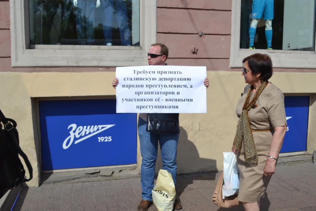Полтора десятка человек выстроились цепочкой на Невском проспекте на положенном расстоянии друг от друга, держа в руках плакаты: "Крымские татары – коренное население Крыма", "Депортация народа – преступление, у которого нет срока давности", "18 мая 2014 года – 70 лет депортации крымско-татарского народа", "Верните родину Мустафе Джамилеву – признанному лидеру крымско-татарского народа". Около четырех часов дня к активистам стал подходить человек, одетый в черное, в черных ботинках-"берцах". Он выражал недовольство плакатами и требовал их убрать. Получив отказ от активиста "Солидарности" Мирослава Романова, державшего плакат с главным лозунгом акции – "Требуем признать сталинскую депортацию народов преступлением, а организаторов и исполнителей – военными преступниками", человек достал нож и сверху вниз ударил по плакату, при этом ранив в живот активиста. Сделав это, он спокойно отправился дальше по Невскому проспекту, и только благодаря тому, что за ним бросился сопредседатель "Солидарности" Константин Ершов, а также благодаря расторопности сотрудников полиции, в особенности майора ДПС Новикова, человека с ножом удалось задержать.