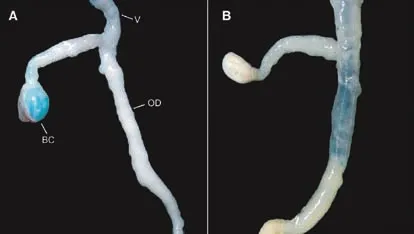 Чтобы определить, насколько действие слизи универсально для стрелоносных наземных улиток, японские ученые объединили усилия с Джорисом Коэном, который к тому времени перебрался в Амстердамский свободный университет (Vrije Universiteit Amsterdam). На сей раз они выбрали для исследования эндемичную японскую сухопутную улитку Euhadra peliomphala из семейства Bradybaenidae [3]. Улиткам, анестезированным инъекциями хлористого магния, ввели в половую клоаку пластиковые трубочки диаметром 0,5 мм. В тело улитки вокруг полового отверстия вкололи взвесь гомогенизированной пальцевидной железы другой взрослой улитки в растворе соли. Затем через вставленную трубочку вводили в половую систему раствор соли, окрашенный альциановым синим. Спустя минуту улиток препарировали и наблюдали за распределением красителя в половой системе. Где в эксперименте оказалась краска, там в реальной жизни должна быть сперма. У всех 15 улиток, которым сделали инъекции слизи, краситель окрасил яйцевод. У 11 из 15 контрольных моллюсков краска попала в семяприемник, где происходит разрушение гамет, а у остальных четырех и в семяприемник, и в яйцевод. Видимо, слизь изменяет форму протоков женской половой системы улитки. Это означает, что у E. peliomphala, как и у C. aspersum, она обеспечивает попадание семени в яйцевод и не пускает его в гаметолитический орган. Необходимая для этого концентрация слизи примерно одинакова для обоих видов и составляет 1,0-1,75 мг/мл крови.