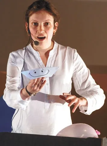 Марианна Иванова, кандидат медицинских наук, рассказала о генетической диагностике глазных заболеваний. В ее выступлении яблоки символизировали уже не водород, а фотоны; в то же время зрительный зал превратился в глазную сетчатку: первый ряд — ганглиозные клетки, второй и третий — биполярные, четвертый и пятый — фоторецепторы, на галерке разместились пигментные клетки, защищающие сетчатку от избыточного попадания света. Под бодрую музыку зрители по цепочке передавали фотоны с задних рядов на передние — так информация о внешнем мире попадает в наш мозг.