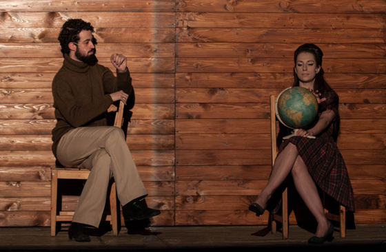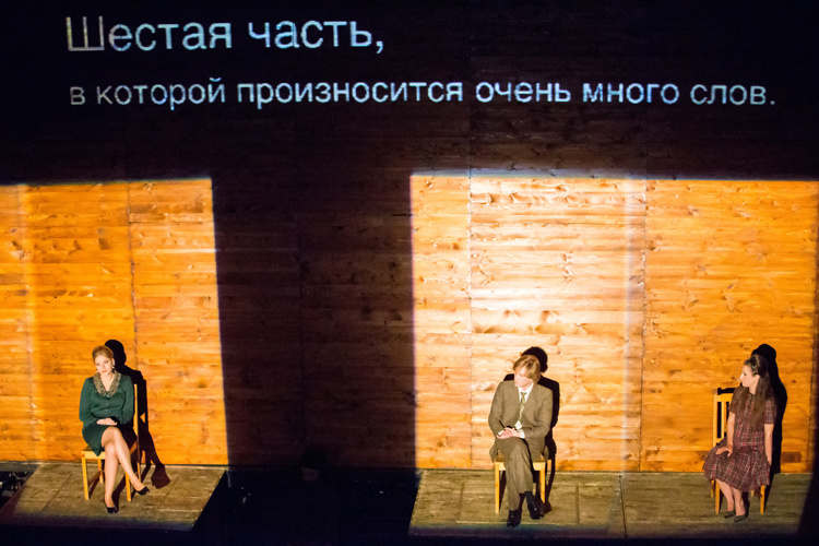 © Театр на Таганке Монтаж очерков, статей, прозы и стихов, опубликованных в «Новом мире» в год, когда по всей Европе гремели студенческие бунты, а в Прагу вошли советские танки, озвучивается со сцены тремя девушками и двумя юношами в джинсах, платьях и свитерках по типовой моде шестидесятых — и душевность, помноженная на скрытую иронию, делает видимой саму фактуру текста, его специфический стиль, порой легко затемняющий смысл сказанного. Другая группа источников, используемых Волкостреловым, — театроведческие выступления Майи Туровской и Константина Рудницкого, любопытные приключениями идей: вдохновленный Брехтом, кто-то из них задается вопросом о потенциальной активности зрителя и сетует на пассивность советских актеров, которые не в состоянии прервать спектакль на середине и задать вопрос: «А что это все значит?» Спектакль Волкострелова тоже работает со зрительским воображением как с партнером в диалоге: титры разговаривают с нами «поверх» и поперек действия, в первом же титре сказано, что это часть, «в которой ничего не происходит», а в финале титр «просит» зал проголосовать за или против эпилога — который, впрочем, показывается вне зависимости от итогов голосования.