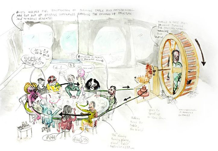 Но хотя на эскизе-карикатуре к своему московскому социохудожественному комбайну художники изображены в «сниженном» виде — пукающими и блюющими, то есть телесно отдающими свой художественный продукт в результате вращения колеса, — в реальности встроенности через тело не получилось, все испортила культура. Комбайн, который построили «желатины» в помещении «Солянки», является в большей степени метафорой или притчей — в отличие от более буквальных, выходящих прямо из тела работ. С другой стороны, именно высокая метафоричность структуры Runde активно провоцирует участников на самоинтерпретации. Впрочем, тут есть и рекламная хитрость — яркие метафоры легче продавать, и потоки интерпретаций рождаются не только у художников, но также у журналистов, которые пишут о выставке. Парадоксальным образом эта притча-комбайн заставляет участников задуматься о своем месте в производстве, но одновременно заслоняет от них истинное положение. Увлеченно записывая красками поверхность и набираясь вином, они выдвигают разные версии касательно смысла своего существования в этом круге, заставляя вспомнить важный антиутопический мотив из 1990-х, который описан в пелевинском рассказе «Затворник и Шестипалый» — там цыплята обсуждают, как устроен их мир: а жили они на птицефабрике. Хитрость тут только в том, что сами «желатины» хоть и участвуют в работе наравне с другими художниками, но — на других условиях.