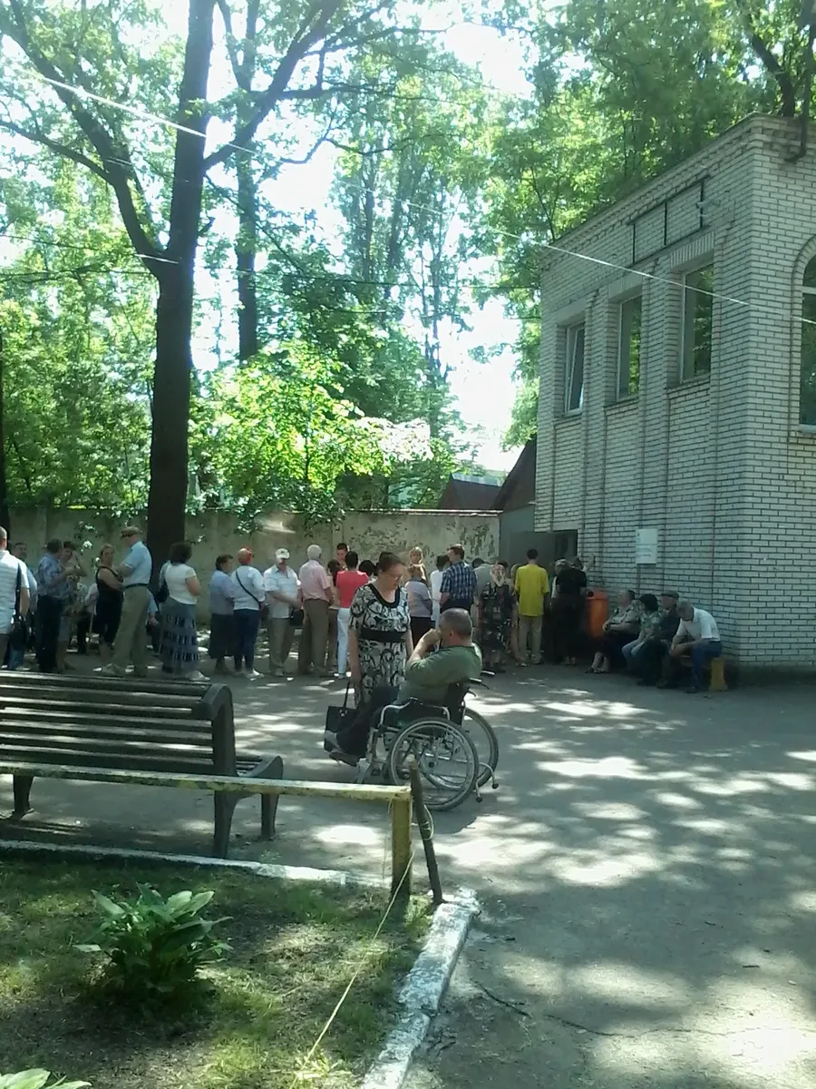 Помещение — метров 50 — забито народом, однако еще далеко даже до полудня. Распахнули окна. Ворчат, но не скандалят. Делятся друг с другом водой и лекарствами. Прозрачные урны теснятся в рядок, над ними прикноплено полотнище государственного флага. Названия улиц и номера домов написаны фломастером на листках белой бумаги — похоже, участок действительно оборудовали в авральном порядке.