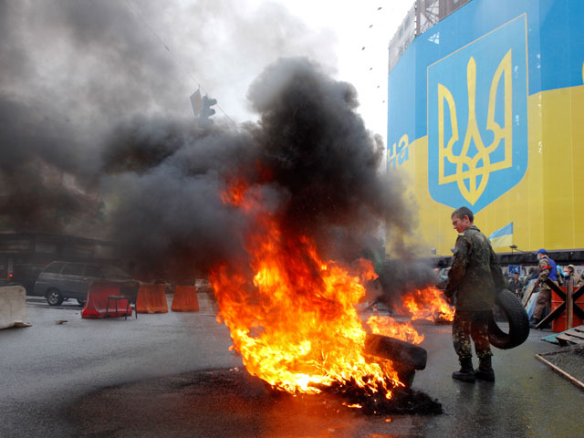 На Майдане в центре Киева снова жгут покрышки. Начали разбирать баррикады