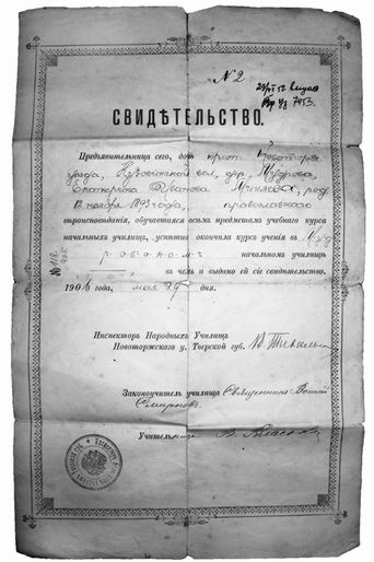 В ходе работы выяснилось, что в конце XIX века в деревне было начальное училище. Мне удалось узнать, какое образование получила моя прабабушка. Среди немногих документов, которые сохранились в нашей семье, есть один, говорящий о том, что «предъявительница сего, дочь крест. Новоторж. Уезда, Кузовинской вол., дер. Мудрова, Екатерина Иванова Миняева, род.[8] 12 ноября 1893 года, православного[9] вероисповедания, обучавшаяся всем предметам учебного курса начальных училищ, успешно окончила курс учения в Мудровском начальном училище, в чем и выдано ей сие свидетельство 1906 года, мая 29 дня».