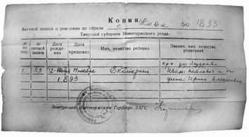 У каждого человека есть день, которого он особенно ждет, надеясь, что с его наступлением в жизни может произойти чудо. Этот день — день рождения человека. У каждого из нас есть документ, удостоверяющий это событие, — свидетельство о рождении. Свидетельство о рождении моей прабабушки Екатерины Ивановны, а я ее тезка, утрачено. Зато в нашем домашнем архиве есть небольшой (21 × 11 см), грязного желтого цвета уникальный документ — копия актовой записи церкви села Кова[6] за 1893 год. Этот документ был выдан заведующим Новоторжским городским бюро ЗАГС (дата не указана). Согласно этой записи 12 ноября 1893 года в семье крестьян деревни Мудрово Лихославльского уезда (сегодня Лихославльский район Тверской области) Ивана Павловича и его жены Ирины Алексеевны родилась дочь. Так я узнала имена своих далеких предков, имена прапрабабушки и прапрадедушки.