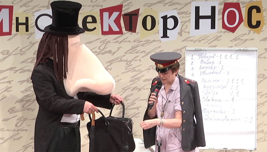 Отношение к детективу оно имело весьма отдаленное: таким образом, вероятно, актеры демонстрировали происхождение ускользающего жанра, битву старого советского детектива с новым российским. Зато дальнейшие костюмированные репризы больше отвечали случаю: дебаты время от времени прерывали дружинники, хулиганы с револьверами, сыщики с биноклями, агенты НКВД и даже Фантомас. Прохорова всякий раз указывала незваным гостям жезлом на дверь.