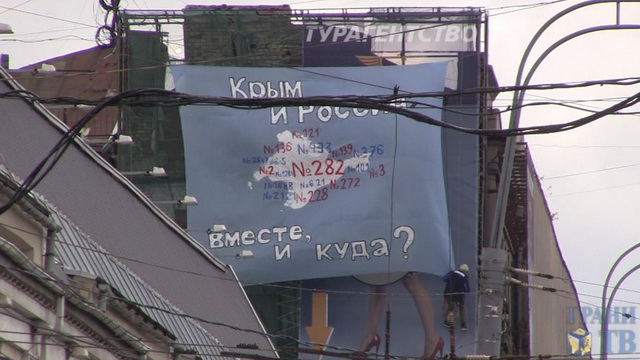 В Москве на Таганской площади рядом с гигантским граффити "Крым и Россия вместе навсегда" гражданские активисты вывесили протестный баннер. Об этом сообщает корреспондент "Граней". Текст на огромном полотнище гласит "Крым и Россия вместе, и куда?". Также на растяжку нанесены контуры оккупированного полуострова с номерами статей УК России и российских законодательных актов, грубо нарушающих права человека.