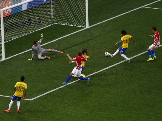 События на поле в первом тайме были под стать антуражу. Хорваты вовсе не испытывали трепета перед хозяевами чемпионата и уверенно навязали бразильцам контригру. Первый мяч на чемпионате мира-2014 забил бразилец, но в свои ворота. На 11-й минуте экс-армеец Ивица Олич прорвался по левому флангу и прострелил на Никицу Елавича, но того опередил Марсело, став автором автогола - 0:1 (ВИДЕО). К слову, это был первый случай в истории сборной Бразилии, когда они забили мяч в свои ворота в финальной части чемпионатов мира.