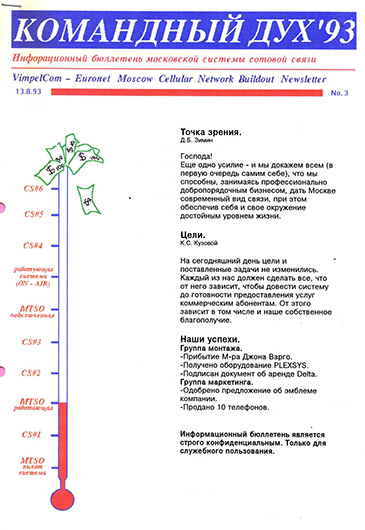 — Понимаете, таких категорий не было, хотя были абсолютно рубежные моменты. В 93-м году Фабела решился заключить с «Вымпелкомом» договор о продолжении кредитной поставки аппаратуры Plexsys, и мы стали строить более или менее серьезную сеть. Мы тогда раз в неделю встречались на деловых завтраках — и к каждому завтраку выпускали боевой листок «Командный дух»: там с одной стороны градусник, который показывал наше положение дел, а с другой — доллары, которые на нас начнут сыпаться после окончания монтажа последней базовой станции. Это нас страшно бодрило и держало в тонусе, несмотря на все сложности. И летом 93-го года на одном из таких завтраков была утверждена эмблема «Билайна» — с пчелой.
