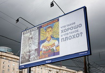 В Москве на Кутузовском проспекте у пересечения магистрали Третьим транспортным кольцом на билборде вывешена репродукция картины Сергея Сотова "Плохой и хороший человек", оригинал которой был в пятницу изъят при обыске в квартире Алексея Навального. Об этом сообщает "Ситибум". Рядом с репродукцией надпись "Что такое хорошо и что такое плохо?".