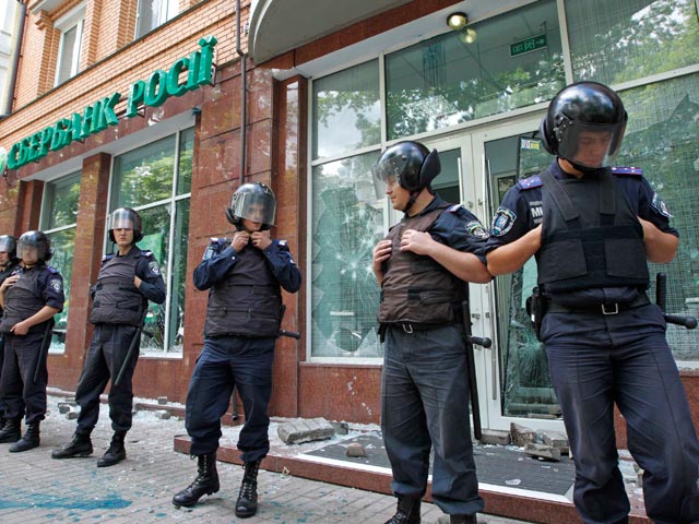 Также в ночь на 21 июня в Бердичеве Житомирской области неизвестные облили красной краской два отделения российских банков. После этого милиция взяла отделения этих банков под усиленную охрану, передает NEWSru.ua".