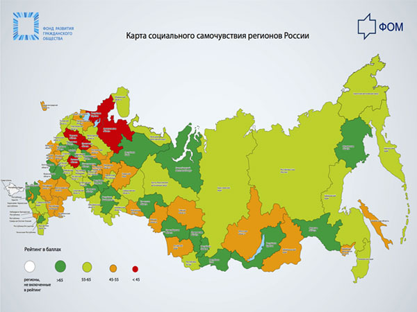 В качестве показателя социального самочувствия ФоРГО использовал опрос ФОМа «Георейтинг», который проходил все всех регионах кроме недавно присоединенных Крыма и Севастополя — их обещают включить после окончания переходного периода. Максимальная оценка в этом рейтинге — 100 баллов, она складывается из нескольких вопросов, каждый из которых дает от 5 до 20 баллов.