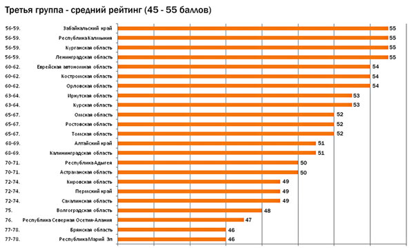 В третей группе, в которой собраны регионы со средним рейтингом, подросла Курская область (53 вместо 50 баллов) и несколько ухудшили позиции Ростовская и Брянская области (52 вместо 54 и 46 вместо 50), однако эти подвижки сложно списать на боевые действия в соседних украинских областях.