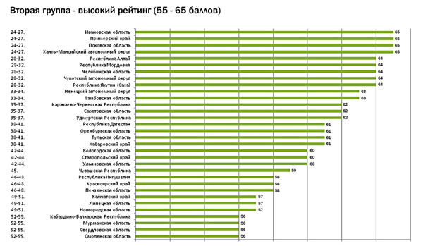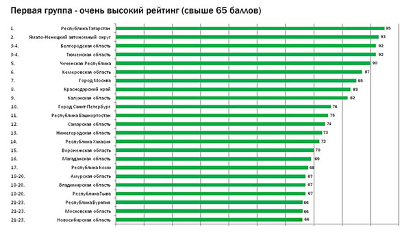 Некоторые изменения есть и среди лидеров рейтинга. Во-первых, благодаря тому, что опросы начали проводиться еще в четырех регионах, в группе с самым высоким рейтингом появился еще один регион — Чечня. Она сразу заняла пятое место с 90 баллами. Ямало-Ненецкий округ уступил лидерство Татарстану (93 и 95 баллов соответственно). Больше 90 баллов также имеют Тюменская и Белгородская области (по 92 балла). Татарстан же является лидером роста — он прибавил за несколько месяцев аж 22 балла.