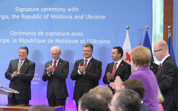 27 июня в Брюсселе Евросоюз подписал соглашения об ассоциации с Грузией и Молдавией и экономический блок документа - с Украиной. Свои подписи под ними поставили премьер-министры Грузии и Молдавии Ираклий Гарибашвили и Юрий Лянкэ, а также президент Украины Петр Порошенко. Кроме того, документы подписали лидеры председатель Европейского совета Херман ван Ромпей и глава Еврокомиссии Жозе Мануэл Баррозу и главы государств и правительств 28 стран ЕС.