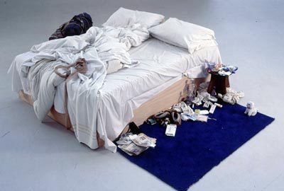 Инсталляция «Моя кровать» представляет собой неубранную постель, вокруг которой разбросан бытовой мусор — произведение отражает новую, современную эстетику, превращающую внешне безобразные вещи в предмет искусства.